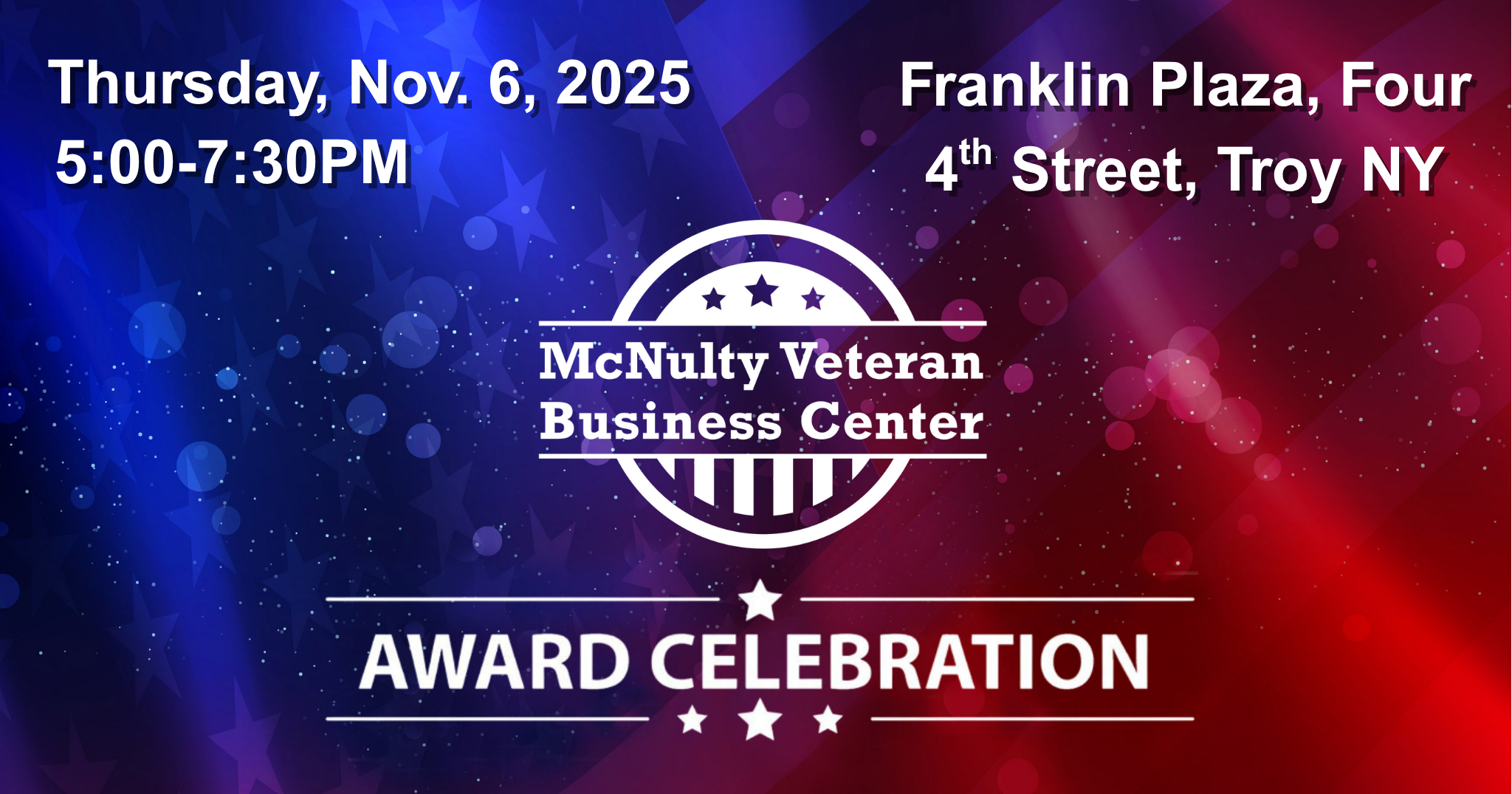 Join us for the McNulty Veteran Business Center Award Celebration as we recognize leaders in our community and present entrepreneurial awards to Veteran business owners we serve. Reception includes wine, beer and soda, (cash liquor) hors d’oeuvres & carving station. There are a limited number of tickets for available, purchase yours today! 20% ticket discount for Veterans. Sponsorship opportunities are available to support this event!